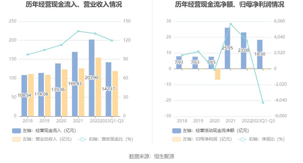 2023年前三季度,公司经营活动现金流净额为18.30亿元,同比下降8.07%;筹资活动现金流净额-28.37亿元,同比增加4.02亿元;投资活动现金流净额3930.26万元,上年同期为-3.01亿元。