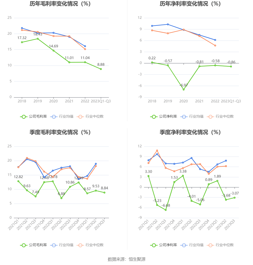 2023年前三季度,公司毛利率为8.88%,同比下降1.60个百分点;净利率为-0.86%,较上年同期上升0.33个百分点。从单季度指标来看,2023年第三季度公司毛利率为8.84%,同比下降2.02个百分点,环比下降0.69个百分点;净利率为-3.07%,较上年同期上升1.99个百分点,较上一季度上升0.61个百分点。
