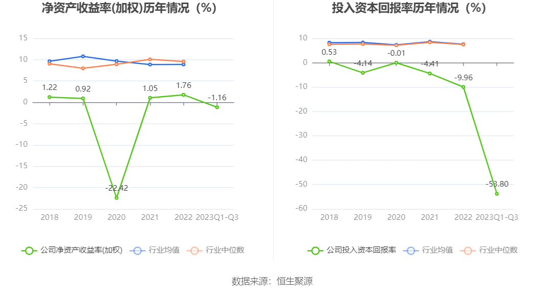 数据显示,2023年前三季度公司加权平均净资产收益率为-1.16%,较上年同期下降0.30个百分点;公司2023年前三季度投入资本回报率为-53.80%,较上年同期下降56.12个百分点。