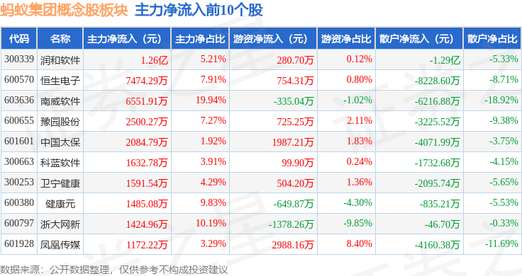 从资金流向上来看,当日蚂蚁集团概念股板块主力资金净流出5.14亿元,游资资金净流入2.15亿元,散户资金净流入2.99亿元。蚂蚁集团概念股板块个股资金流向见下表: