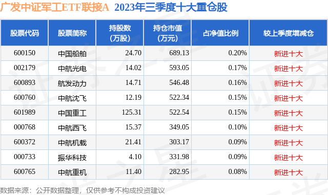 广发中证军工ETF联接A为指数型-股票基金,根据最新一期基金季报显示,该基金资产配置:股票占净值比3.31%,无债券类资产,现金占净值比5.53%。基金十大重仓股如下: