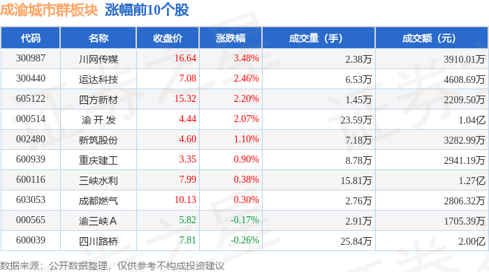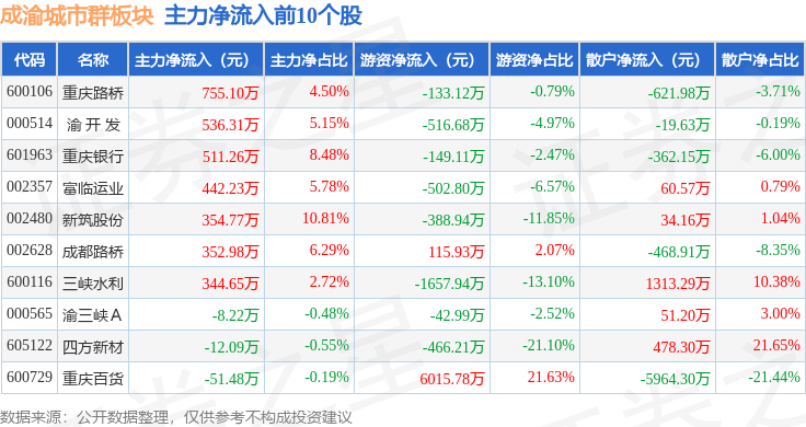从资金流向上来看,当日成渝城市群板块主力资金净流入1019.05万元,游资资金净流入2276.18万元,散户资金净流出3295.23万元。成渝城市群板块个股资金流向见下表: