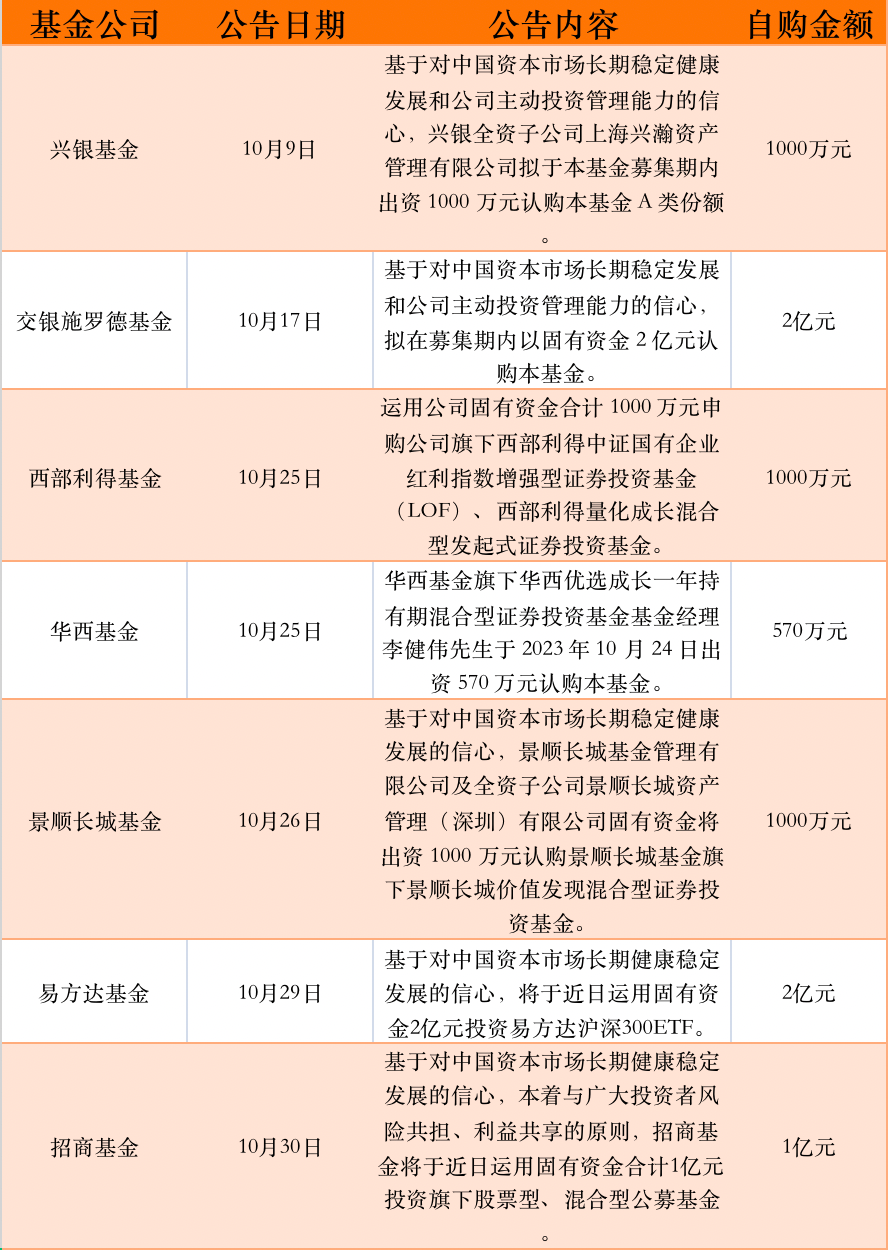 据澎湃新闻记者不完全统计,10月份以来,已有交银施罗德基金、西部利得基金、景顺长城基金等多家基金公司宣布自购,月内自购金额达5.36亿元。