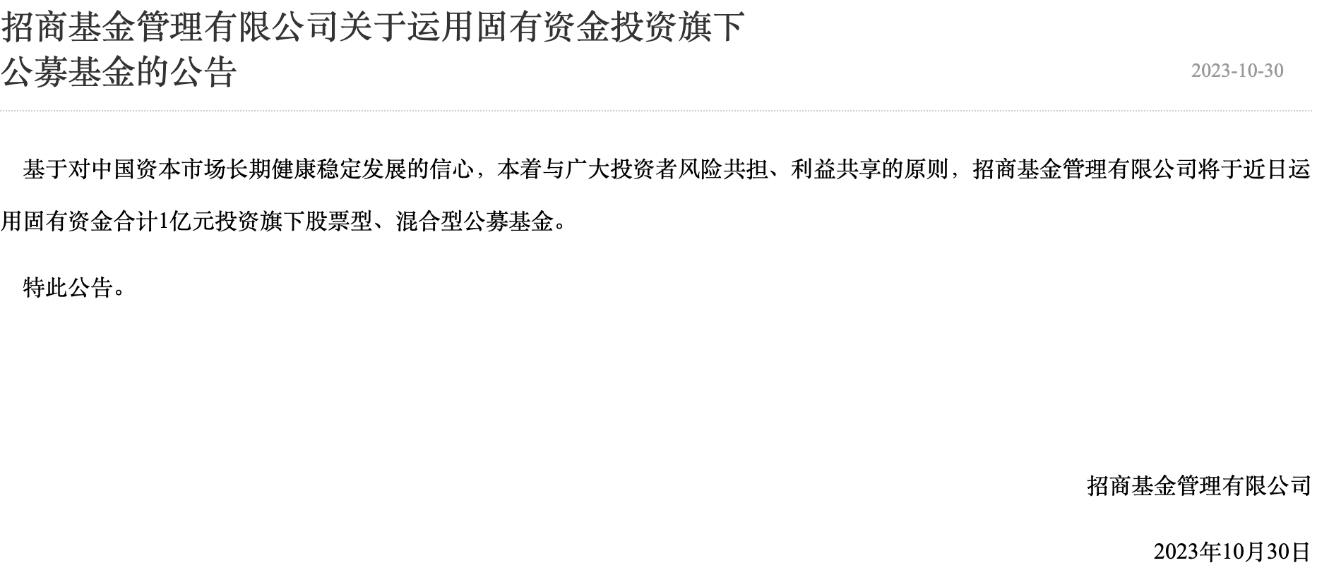 10月30日,招商基金公告,基于对中国资本市场长期健康稳定发展的信心,本着与广大投资者风险共担、利益共享的原则,招商基金将于近日运用固有资金合计1亿元投资旗下股票型、混合型公募基金。