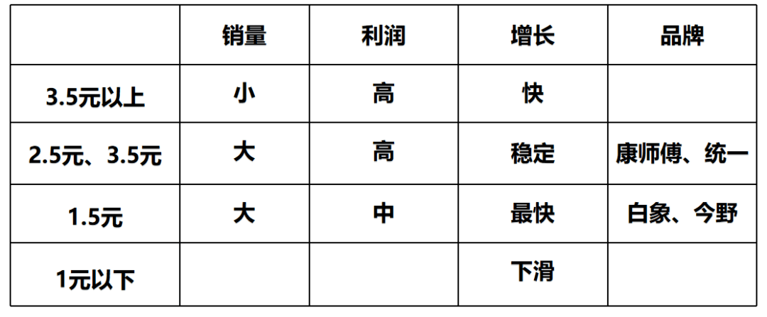 2.5元和3.5元的品类是主流,销量和利润都很好,统一和康师傅在这个赛道处于领导地位。