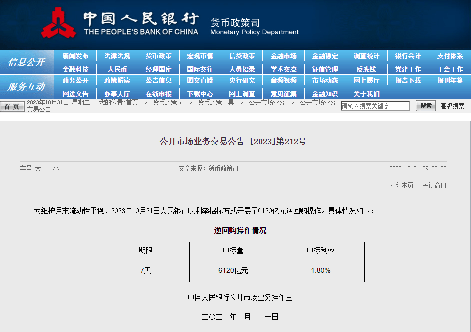 金融界10月31日消息 为维护月末流动性平稳,央行今日进行6120亿元7天期逆回购操作,中标利率为1.80%,与此前持平。今日有5930亿元逆回购到期,当日实现净投放190亿元。