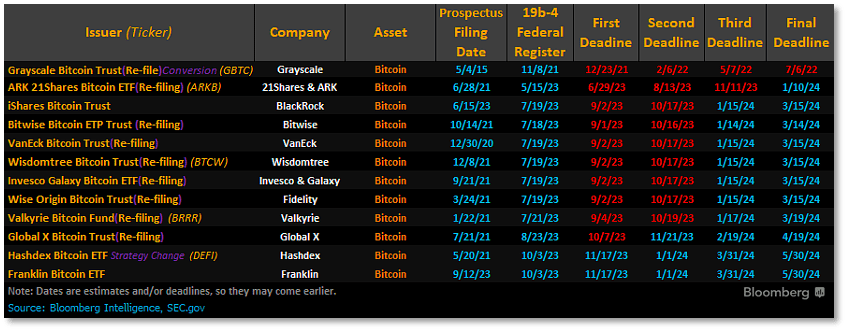 目前,Cathie Wood领导的ARK Invest提交的申请位于审批队列的最前位。其申请的SEC 240天的评论期将在2024年1月10日结束。到那时,监管机构必须做出拒绝或批准的决定。