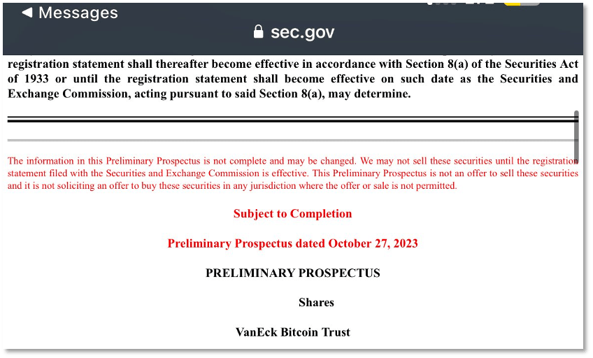 10月24日,莱德旗下的iShares Bitcoin Trust被列入DTCC(美国证券集中保管结算公司)的上市清单中,这一常规流程被解读为“该公司的比特币现货ETF即将获批”,引发比特币市场大涨20%。如今,VanEck也更新了比特币现货ETF的文件。
