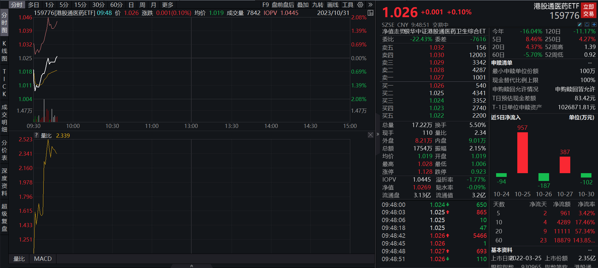 截至2023年10月31日9:48,港股通医药ETF(159776)涨势延续,上扬0.10%,报1.026元,换手率超5%,市场交投活跃。