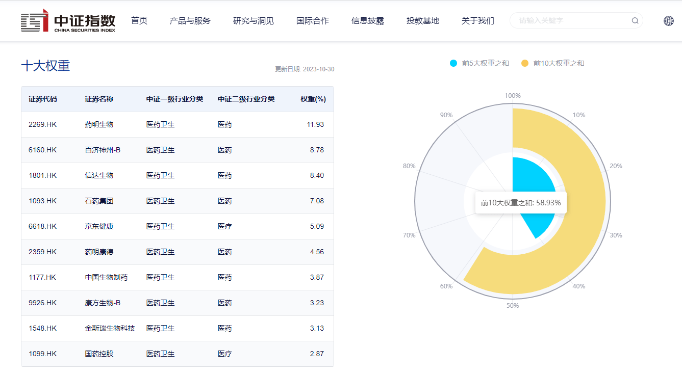 截至2023年10月30日,该指数前十大权重股包括药明生物、百济神州-B、信达生物、石药集团、京东健康等,前十大权重股比重合计约为58.93%。(数据来源:中证指数公司,指数成份股不代表个股推荐)