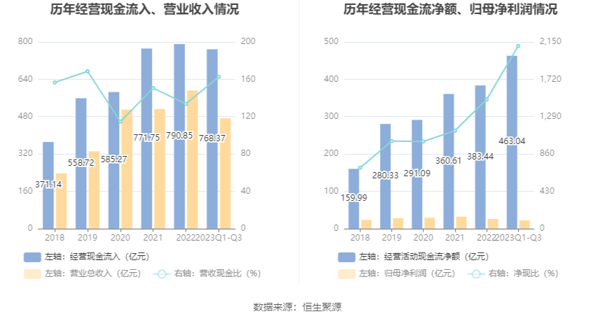 2023年前三季度,公司营业收入现金比为162.62%,净现比为2103.33%。