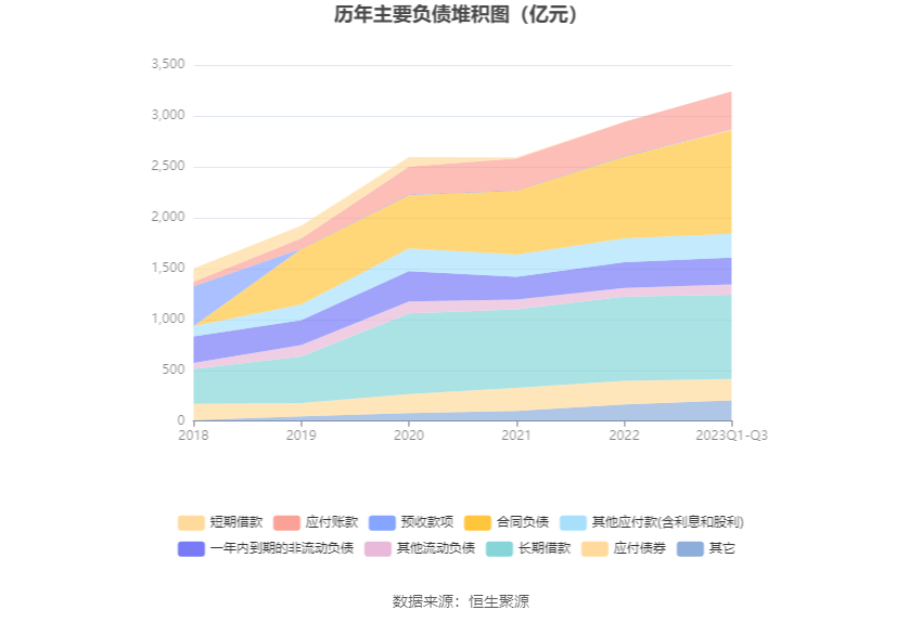 负债重大变化方面,截至2023年三季度末,公司合同负债较上年末增加26.27%,占公司总资产比重上升2.84个百分点;应付账款较上年末增加13.13%,占公司总资产比重上升0.20个百分点;应付债券较上年末减少9.67%,占公司总资产比重下降1.05个百分点;其他流动负债较上年末增加18.29%,占公司总资产比重上升0.15个百分点。