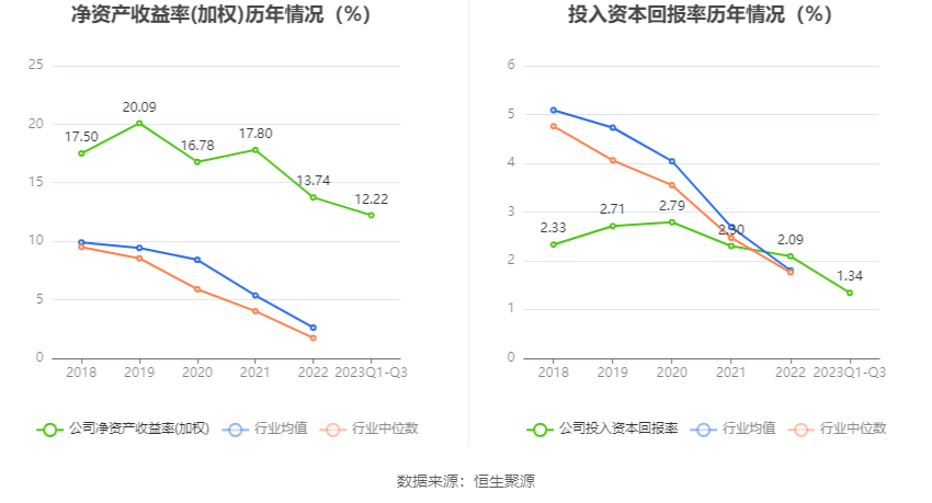 数据显示,2023年前三季度公司加权平均净资产收益率为12.22%,较上年同期增长1.12个百分点;公司2023年前三季度投入资本回报率为1.34%,较上年同期增长0.10个百分点。