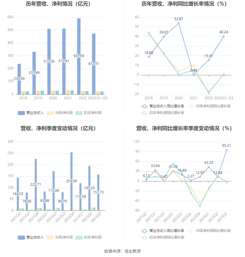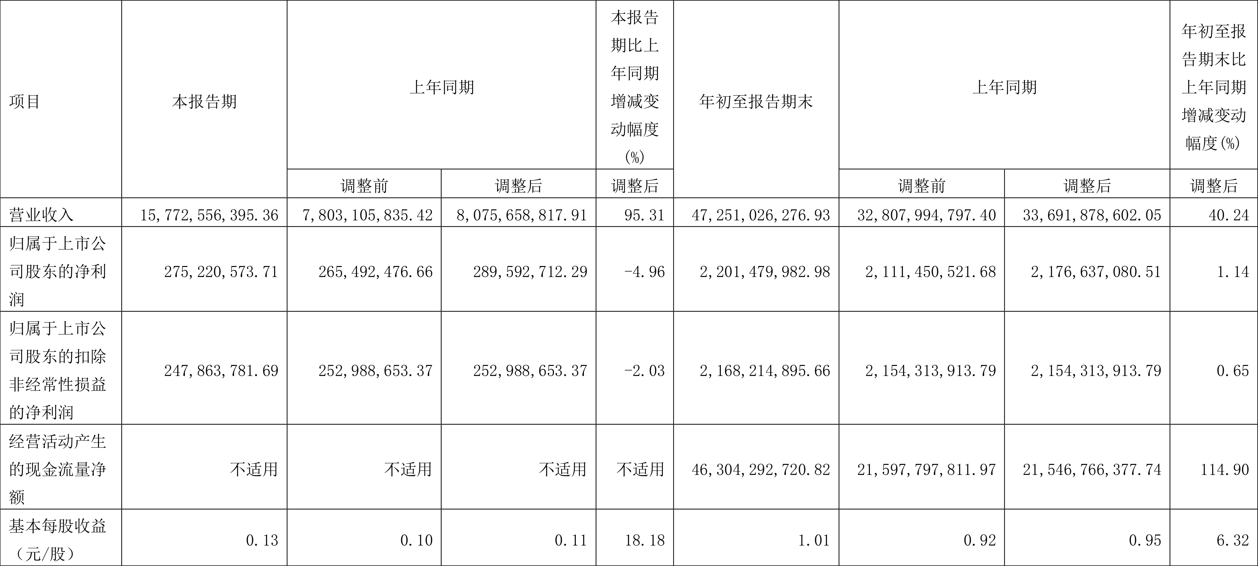 根据三季报,公司第三季度实现营业总收入157.73亿元,同比增长95.31%,环比下降19.20%;归母净利润2.75亿元,同比下降4.96%,环比下降80.15%;扣非净利润2.48亿元,同比下降2.03%,环比下降81.81%。