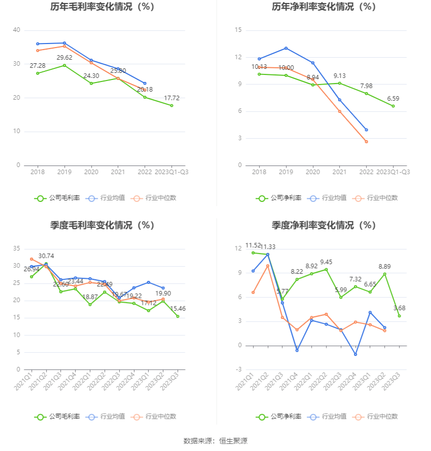2023年前三季度,公司毛利率为17.72%,同比下降3.20个百分点;净利率为6.59%,较上年同期下降1.90个百分点。从单季度指标来看,2023年第三季度公司毛利率为15.46%,同比下降4.21个百分点,环比下降4.44个百分点;净利率为3.68%,较上年同期下降2.31个百分点,较上一季度下降5.21个百分点。