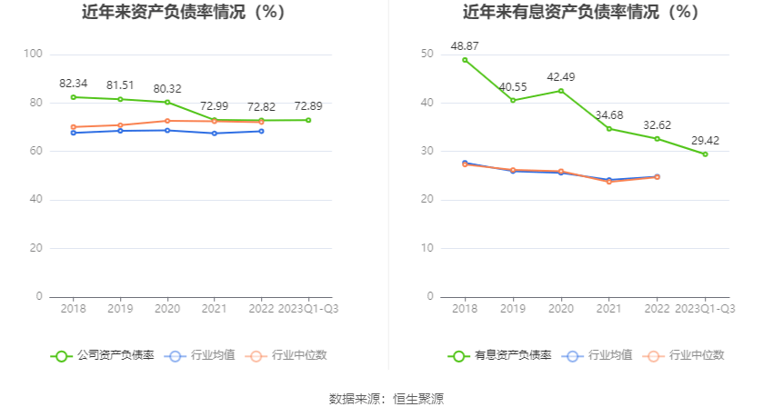 在偿债能力方面,公司2023年三季度末资产负债率为72.89%,相比上年末下降0.05个百分点;有息资产负债率为29.42%,相比上年末下降3.20个百分点。