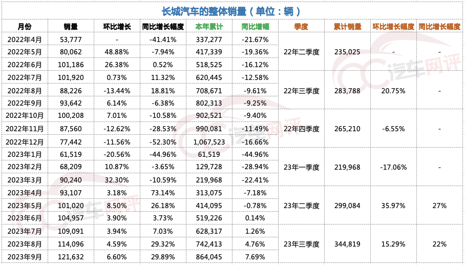从销量上看,长城汽车前三季度累计864,045辆,同比增长7.69%。即便如此,按照长城调整后的至少160万辆的销量目标计算,长城汽车2023年前三季度完成率仅54%。要想完成目标,也就意味着长城在剩余的3个月中,每月最少要达成24.52万辆的销量成绩。客观评价,这对当前的长城而言,简直就是天方夜谭。