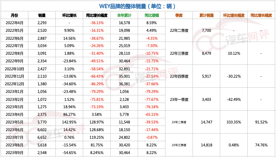魏牌近一年的销量跌幅比较大,来至2023年的8、9月,其累计销量相比去年同期才逐渐缩小差距。但即便如此,也难以掩盖魏牌的尴尬——在提升单车平均售价的过程中,魏牌的力量微乎其微,反而是坦克品牌起到了关键作用,那倒不如称坦克为“高端品牌”。