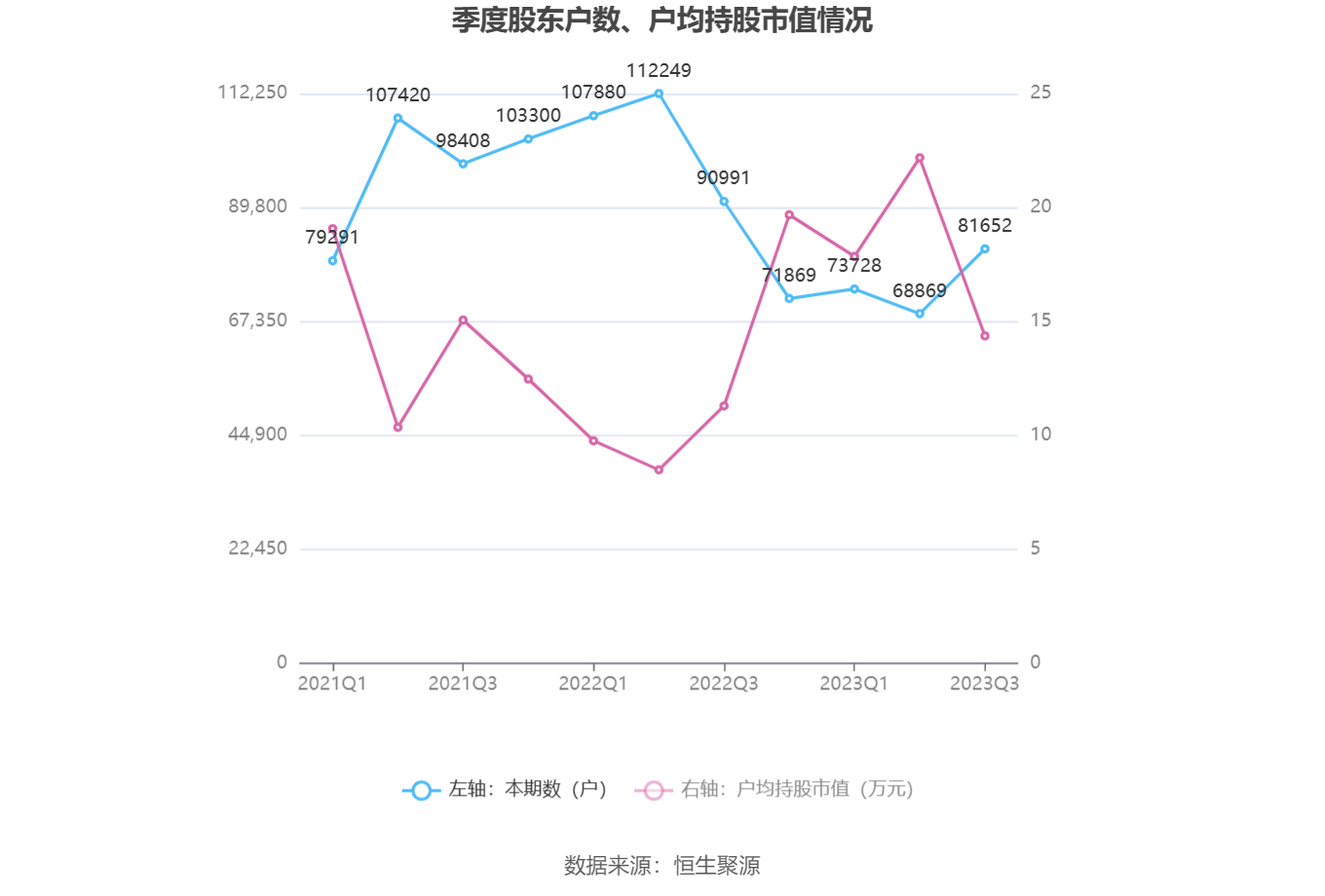 筹码集中度方面,截至2023年三季度末,公司股东总户数为8.17万户,较上半年末增长了1.28万户,增幅18.56%;户均持股市值由上半年末的22.18万元下降至14.36万元,降幅为35.26%。