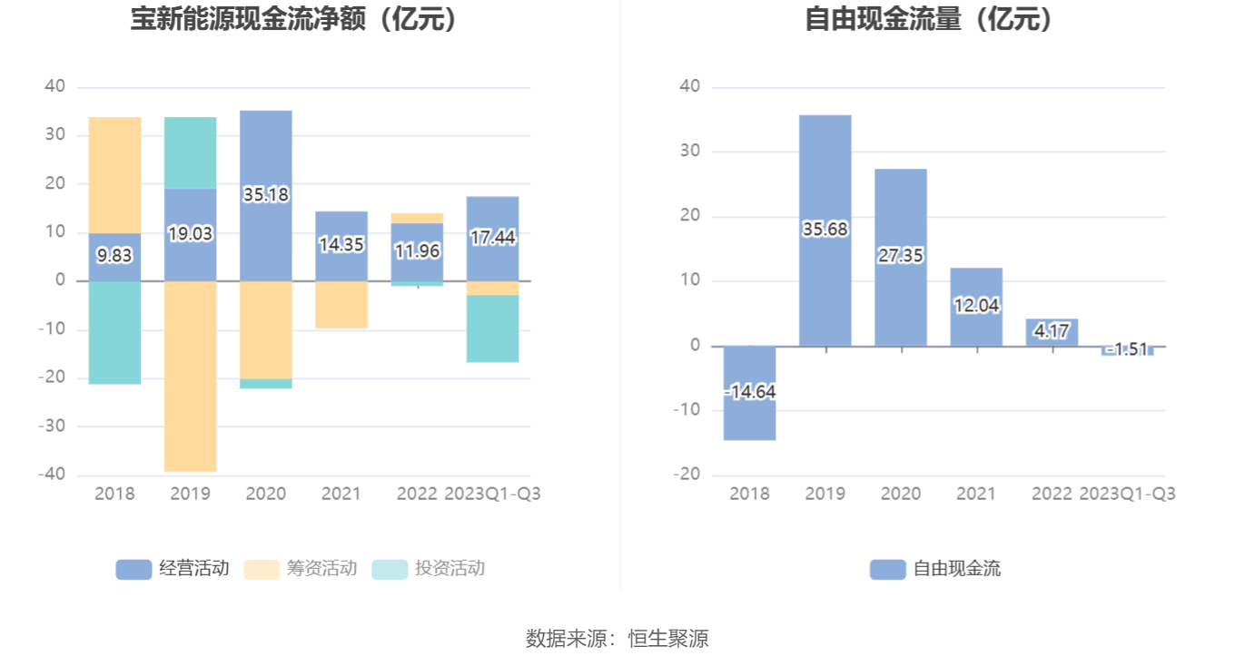 2023年前三季度,公司经营活动现金流净额为17.44亿元,同比增长70.07%;筹资活动现金流净额-2.91亿元,同比减少1.53亿元;投资活动现金流净额-13.87亿元,上年同期为-9217.74万元。