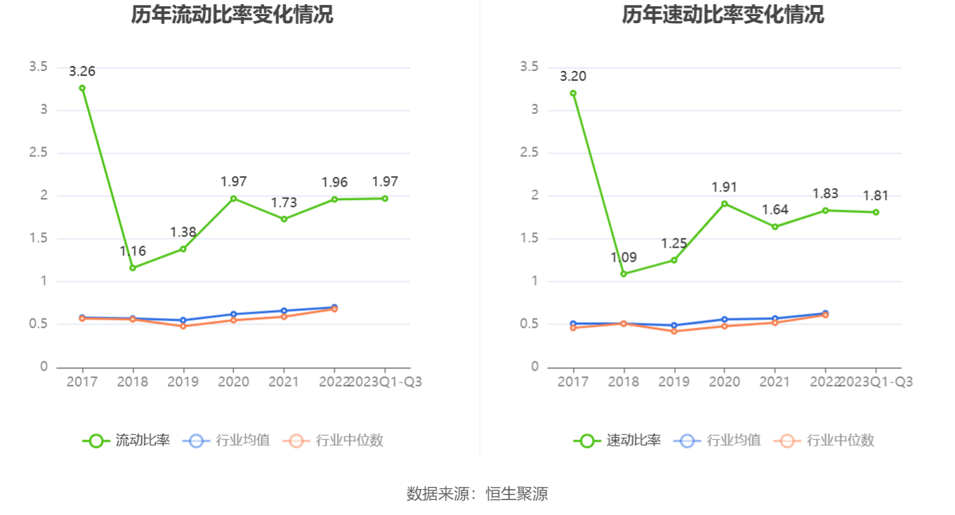2023年前三季度,公司流动比率为1.97,速动比率为1.81。
