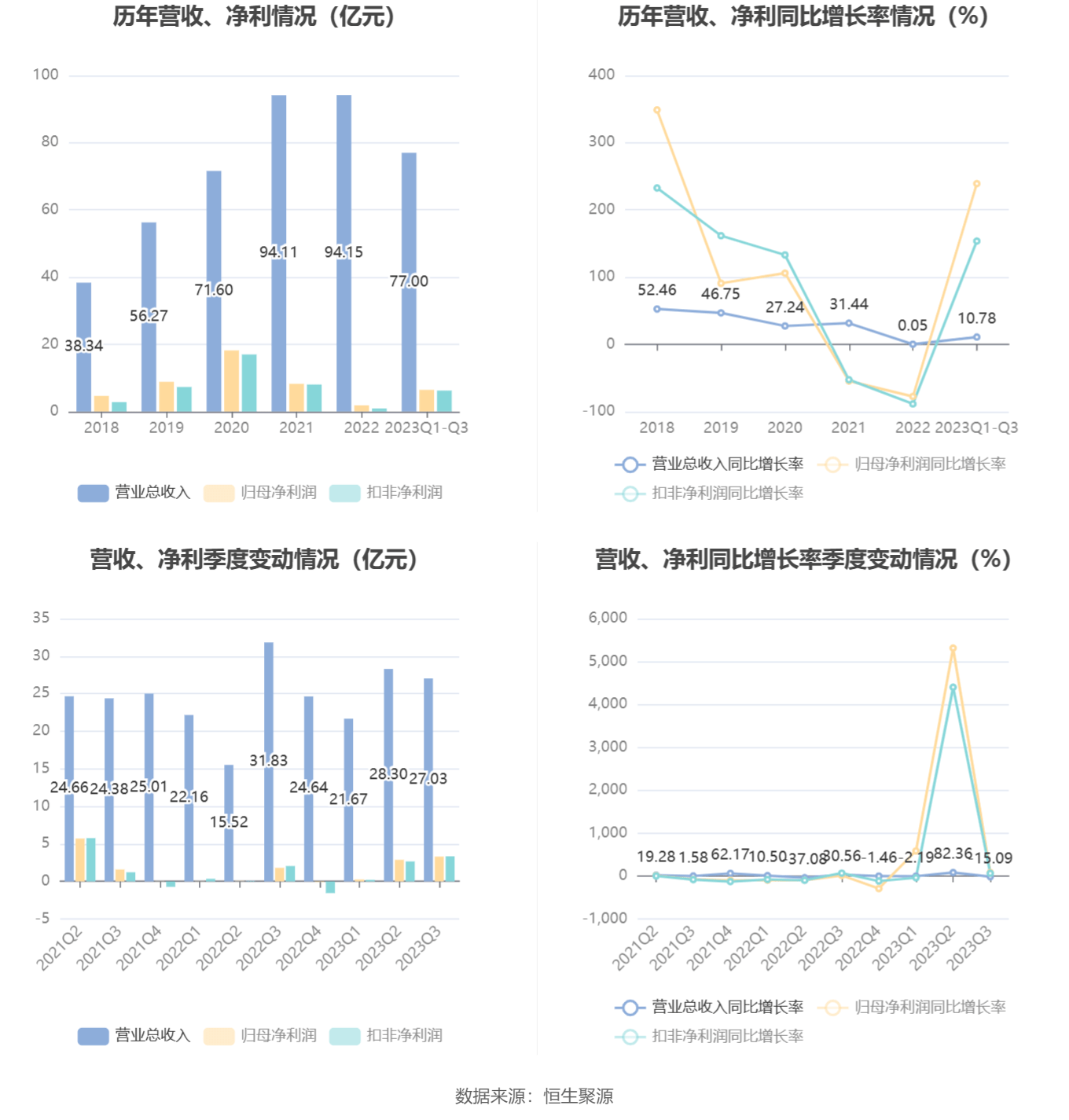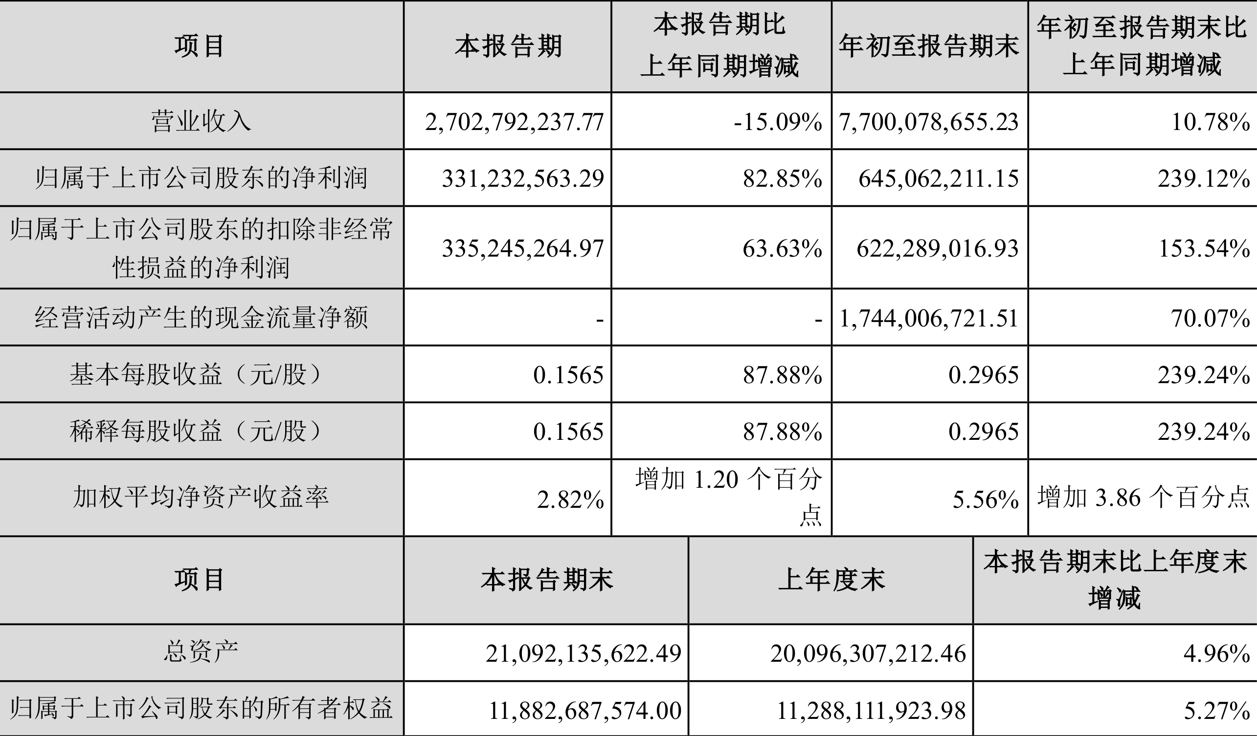 根据三季报,公司第三季度实现营业总收入27.03亿元,同比下降15.09%,环比下降4.49%;归母净利润3.31亿元,同比增长82.85%,环比增长14.96%;扣非净利润3.35亿元,同比增长63.63%,环比增长25.99%。