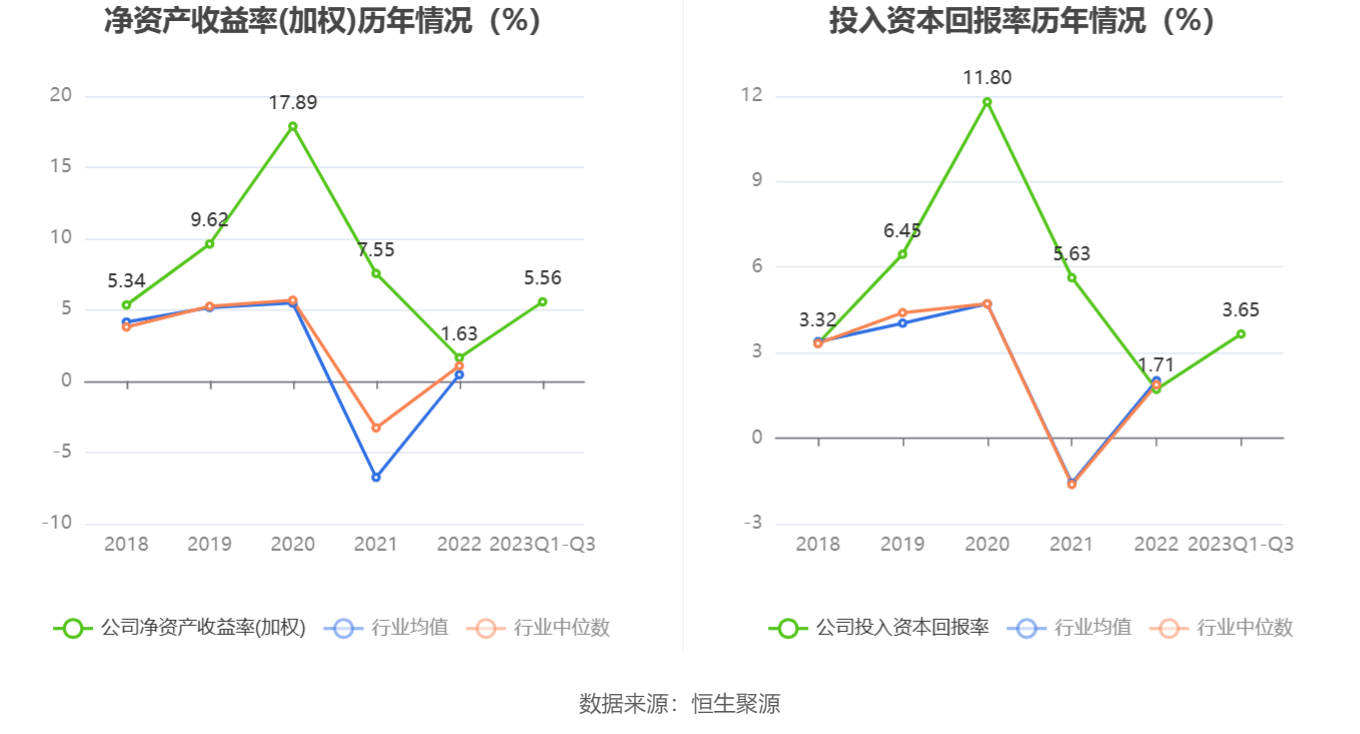 数据显示,2023年前三季度公司加权平均净资产收益率为5.56%,较上年同期增长3.86个百分点;公司2023年前三季度投入资本回报率为3.65%,较上年同期增长2.01个百分点。