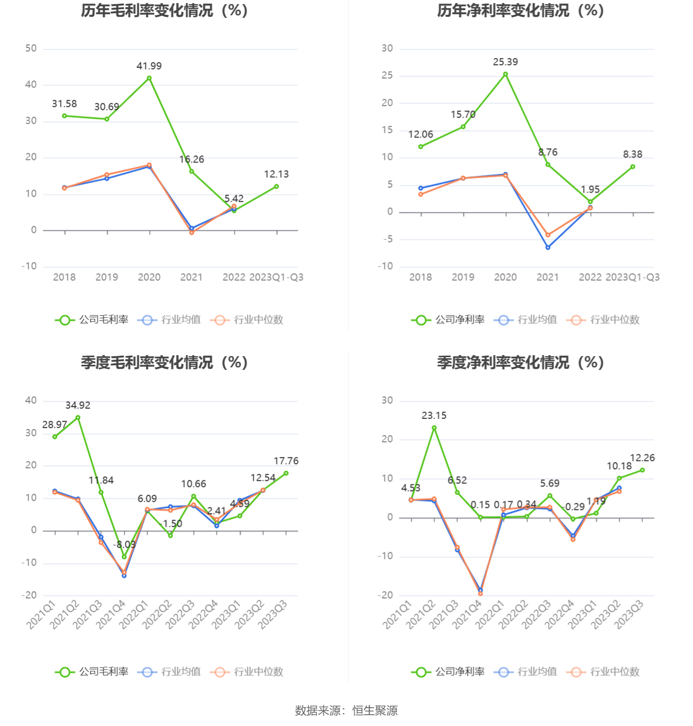 2023年前三季度,公司毛利率为12.13%,同比上升5.64个百分点;净利率为8.38%,较上年同期上升5.64个百分点。从单季度指标来看,2023年第三季度公司毛利率为17.76%,同比上升7.10个百分点,环比上升5.22个百分点;净利率为12.26%,较上年同期上升6.57个百分点,较上一季度上升2.08个百分点。