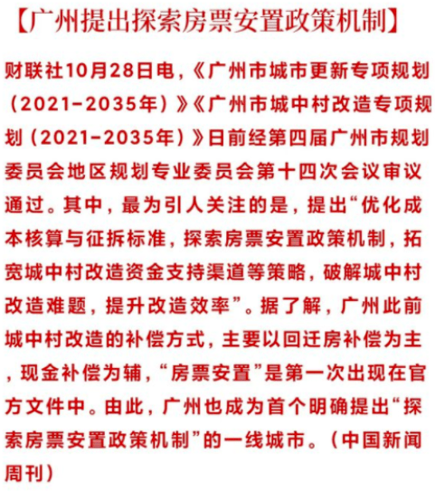 10月28日,《广州市城市更新专项规划(2021-2035年)》《广州市城中村改造专项规划(2021-2035年)》通过了审议,首次提出了“优化成本核算与征拆标准,探索房票安置政策机制,拓宽城中村改造资金支持渠道等策略,破解城中村改造难题,提升改造效率。”