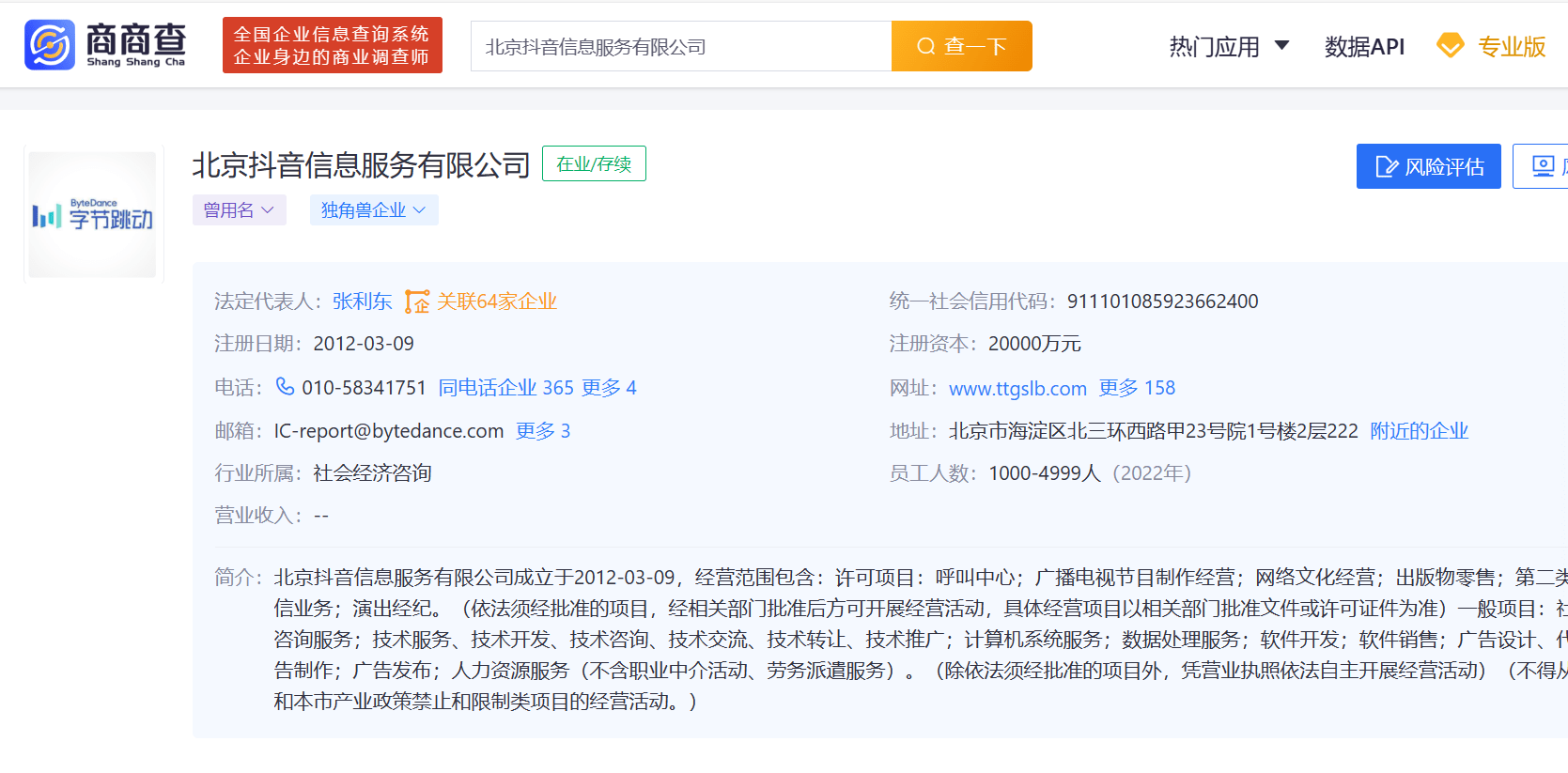 “商商查”显示,字节跳动(以下简称“字节”)是一家以“北京抖音信息服务有限公司”(2012年成立)为主公司,拥有218家成员企业的综合性集团。