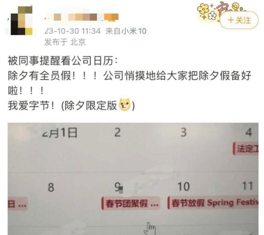 昨日,某社交平台上有多位带有“字节跳动员工”标签的用户称:字节将除夕统一放假,其办公软件“飞书”日历上,已显示除夕当天2月9号为“春节团聚假”。