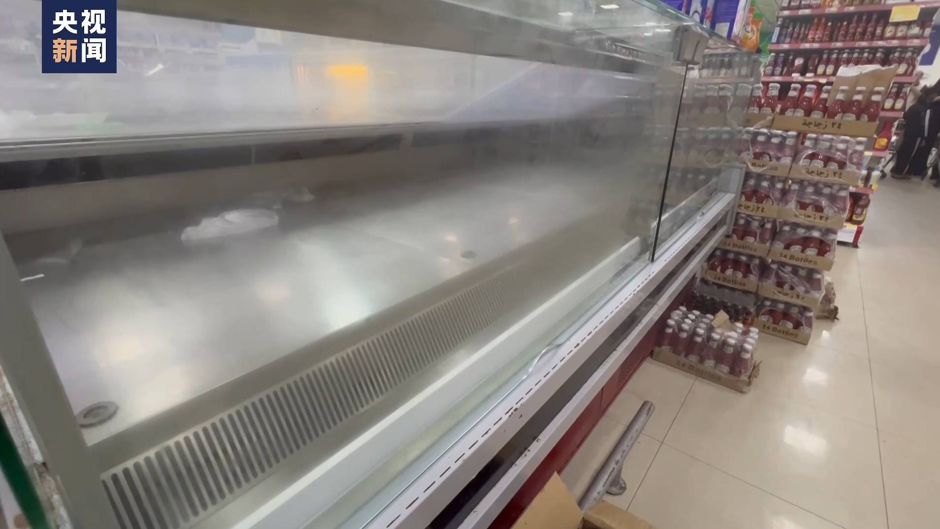 这里是加沙地带南部汗尤尼斯的一家超市,虽然超市依然在营业,但很多的货架已经空空如也。央视新闻 截图