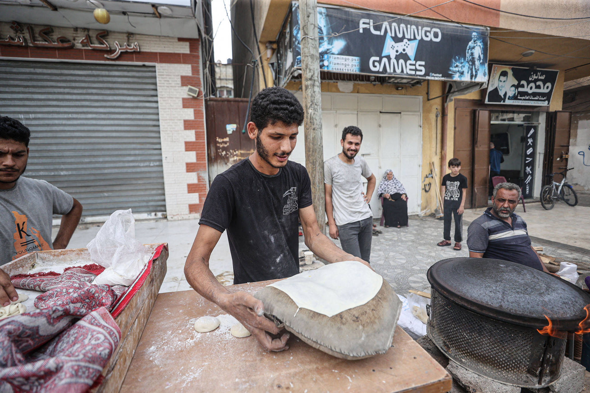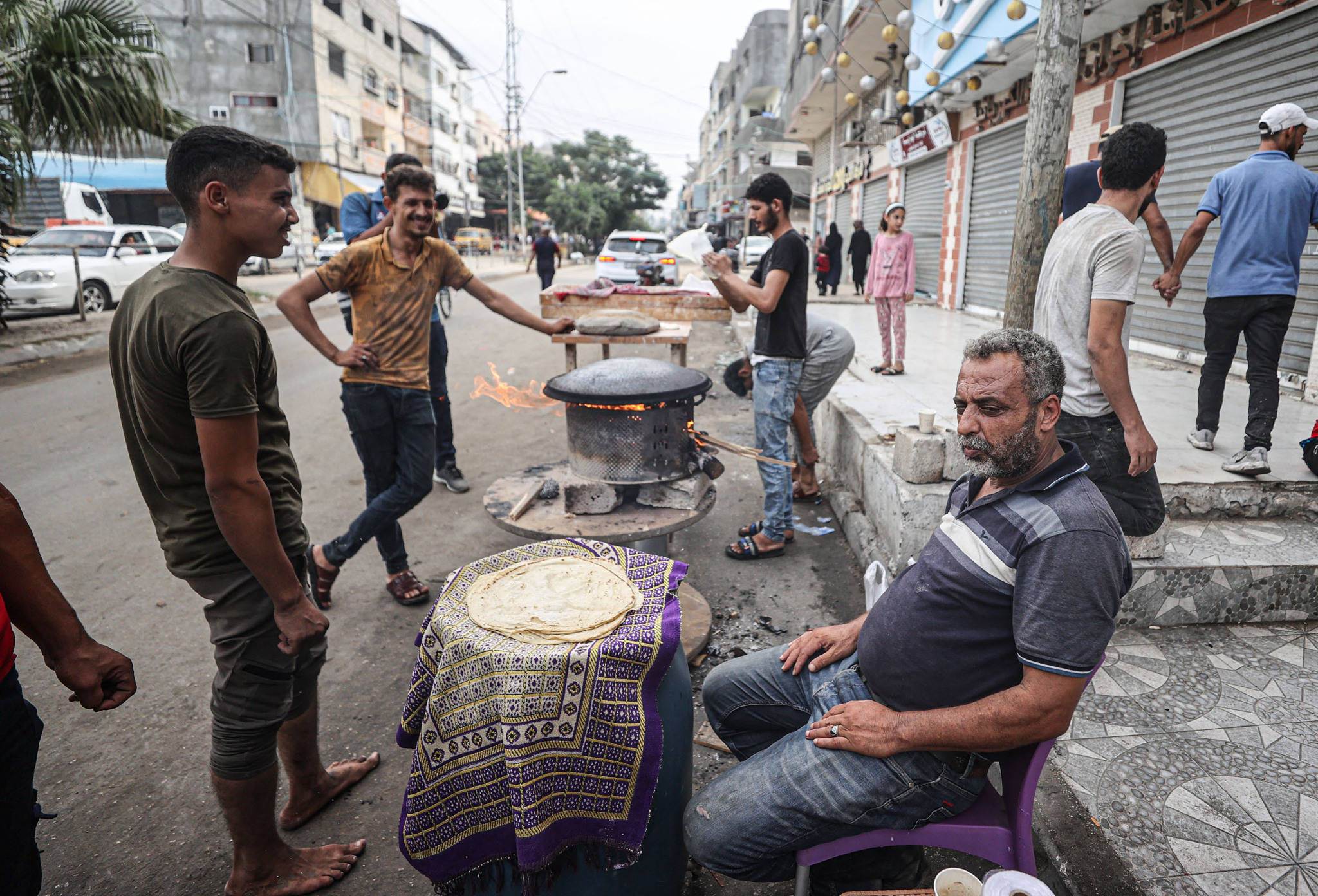 当地时间2023年10月29日,加沙地带,几位居民正在用柴火在金属片上烤面包。澎湃影像 图