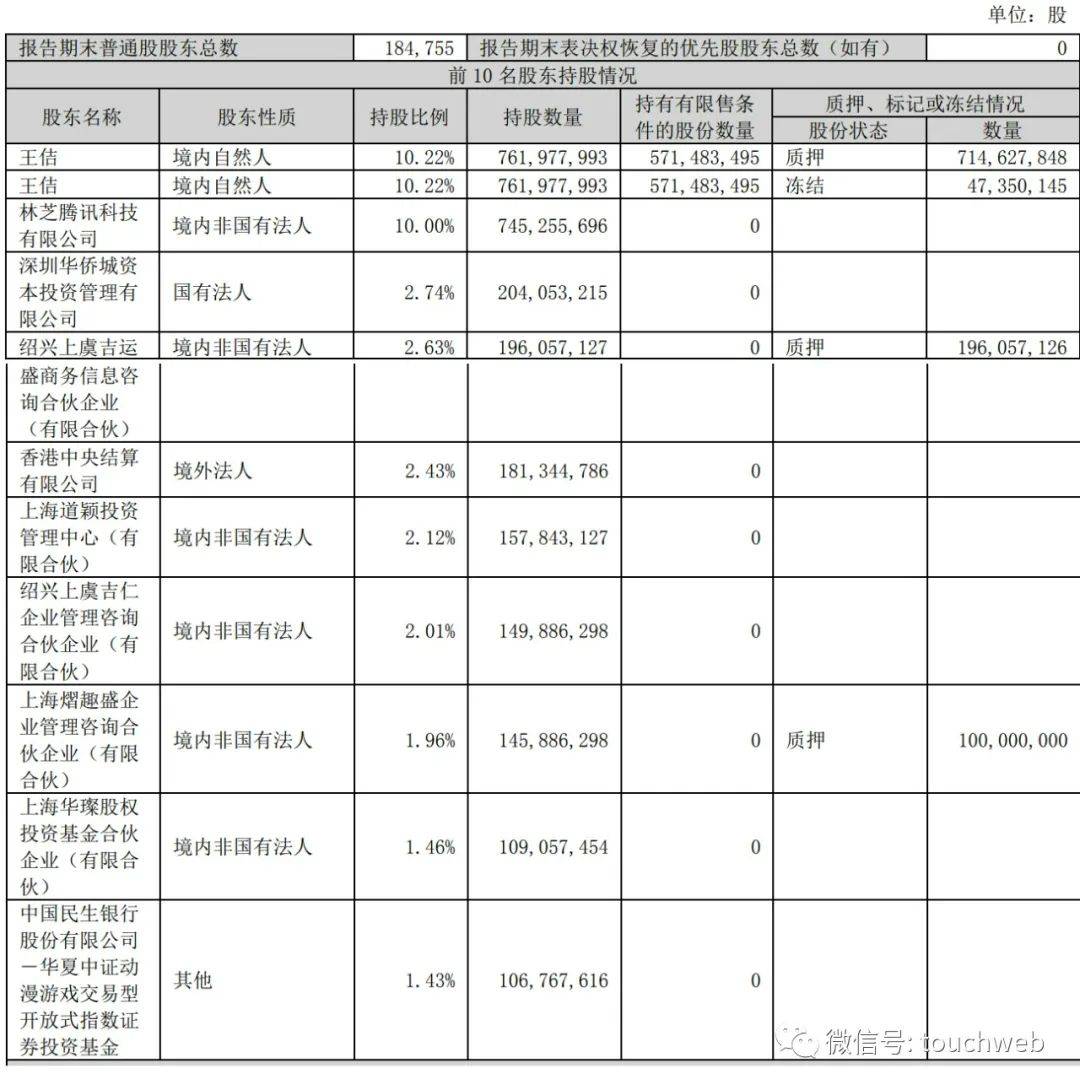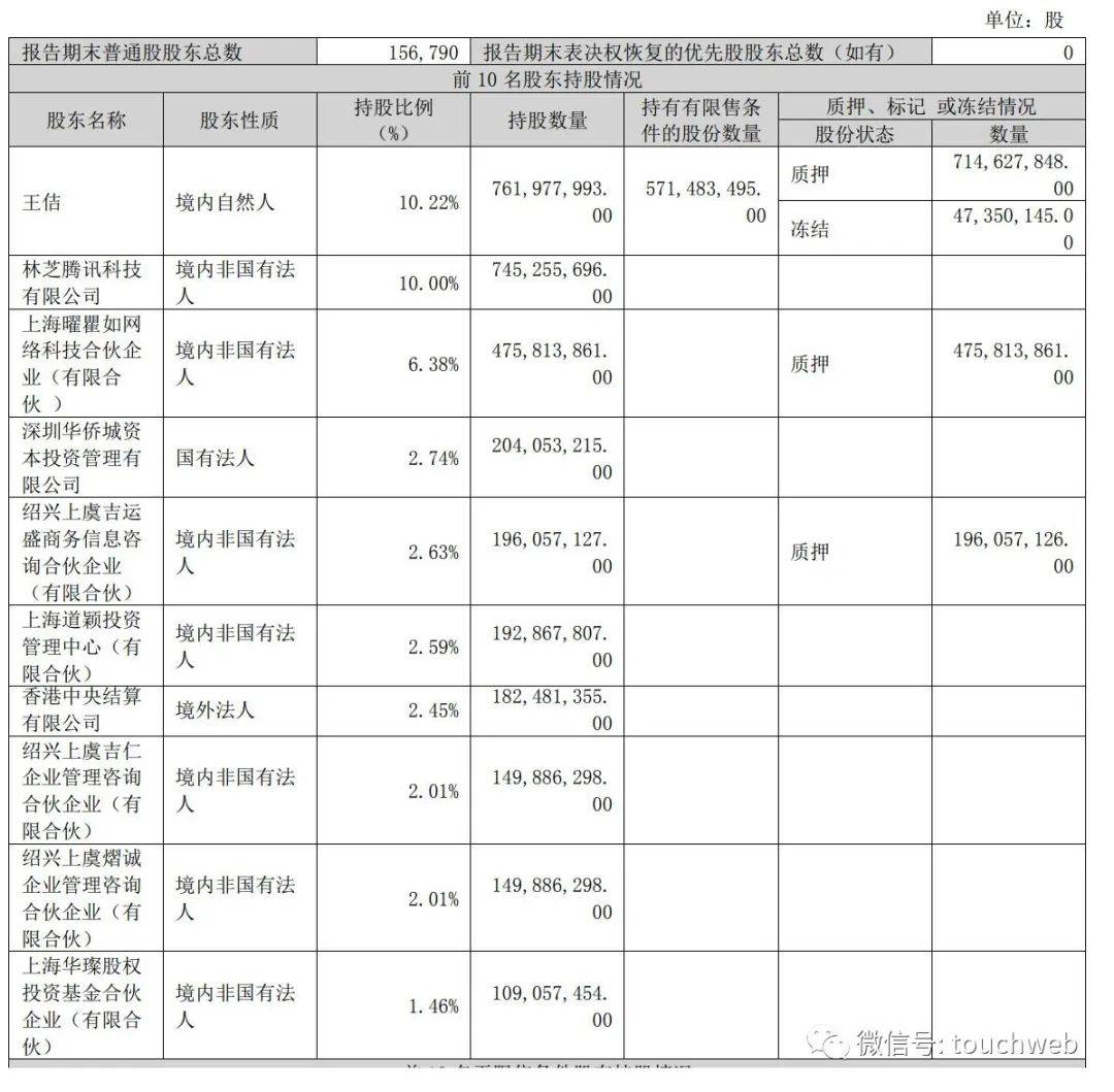 截至2023年9月30日,王佶直接持股10.22%,股权处于质押和被冻结的状态。腾讯持股为10%,深圳华侨城资本投资管理有限公司持股为2.74%,绍兴上虞吉运盛商务信息咨询合伙企业(有限合伙)持股2.63%;