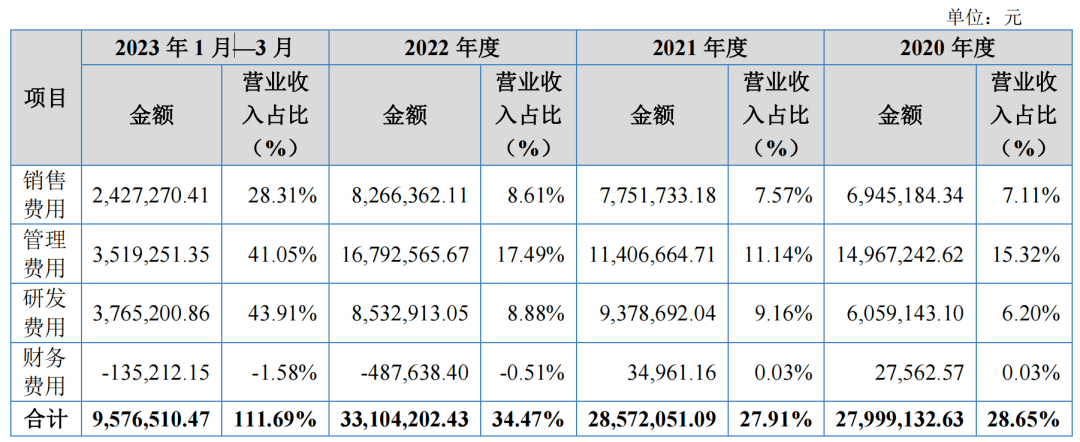 2022年的管理费用上升导致期间费用率同比上升;2023年1-3月期间费用率较高,主要系受到下游客户的项目实施进度与验收时间安排影响,一季度实现营业收入较少,而期间费用在各季度平稳发生所致。