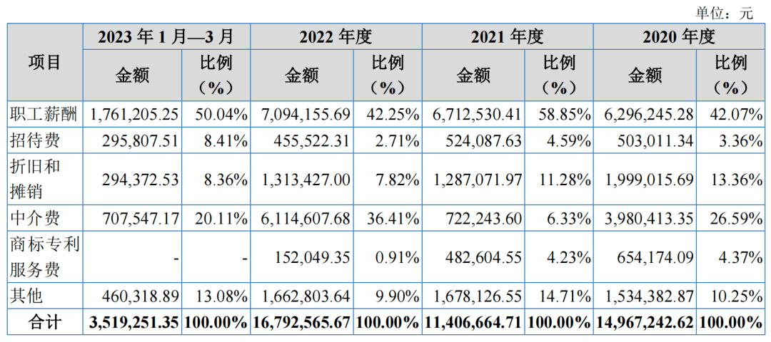 研发方面,其研发费用分别为605.91万元、937.87万元、853.29万元、376.52万元,报告期内完整年度,研发费用率分别为6.20%、9.16%、8.88%,低于同行业可比公司的平均水平,2019年和2022年几乎只有同行均值一半。