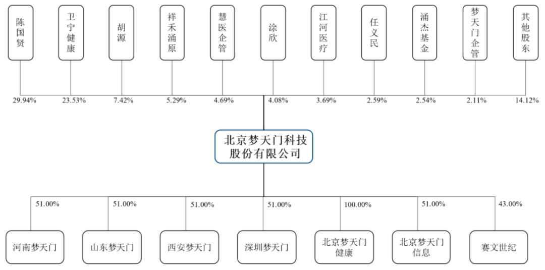递表时,梦天门总股本为5419.30万股,陈国贤直接持1622.625万股,并通过梦天门企管间接持13万股,合计持股30.18%,控制32.05%的表决权,为控股股东、实际控制人。卫宁健康(300253.SZ)作为第二大股东,持股数量1275万股,控制23.53%的表决权。两者持有的表决权比例差为8.52%。