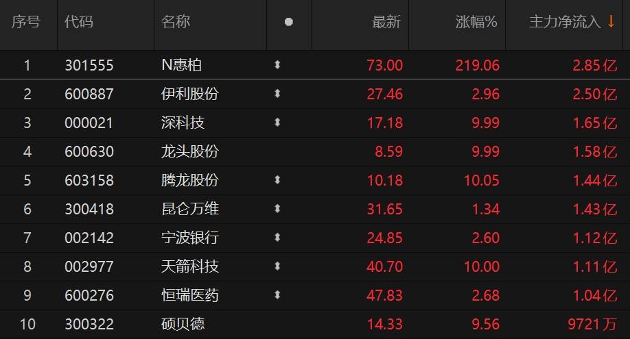 2023年10月31日,今日A股早盘主力资金净流入前十股份,共计净流入15.30亿元。其中N惠柏、伊利股份、深科技位列前三,分别净流入2.85亿元、2.50亿元、1.65亿元。