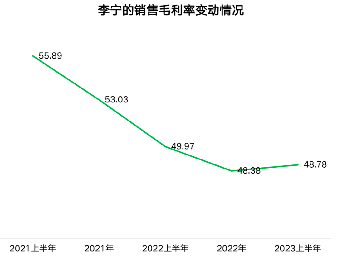 李宁打折清库存带来的阵痛已经体现在财报中,据中报显示,李宁的毛利率从2021上半年的55.89%下降至2023上半年的48.78%。