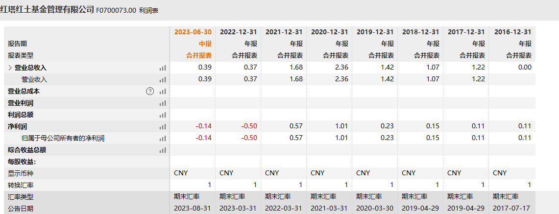 近几年来,伴随A股赚钱效应地缺失,基金公司的盈利能力也开始下滑。而在刚刚过去的2022年,红塔红土基金公司也是首现亏损。数据显示,红塔红土基金当年营业收入首次跌破1亿元,净利润也是由盈转为亏损0.5亿元。最新披露的数据显示,2023年上半年红塔红土基金公司实现营业总收入为0.39亿元,净利润亏损为0.14亿元。