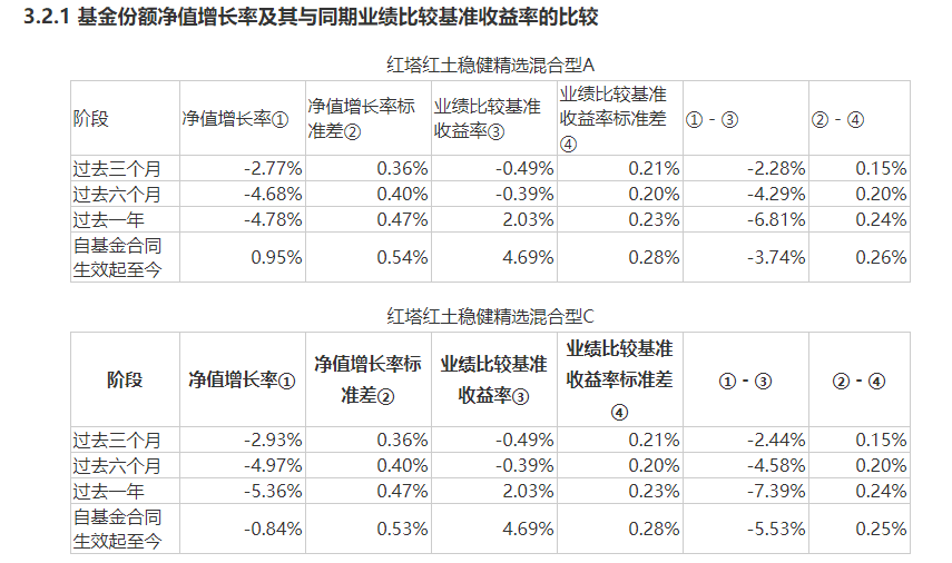 与此同时,无论是过去六个月、过去一年以及基金成来以来,红塔红土稳健精选基金长短期内都是明显跑输业绩比较基准。