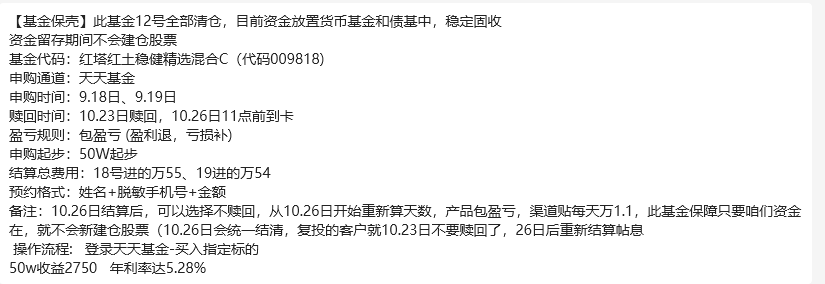 保壳的信息也非常简单,投资者只需要在2023年9月18日或9月19日两天内,拿出50万元从天天基金网申购红塔红土稳健精选混合C,在10月23日赎回,持有收益就能达到了2750元,年化收益达到了5.28%。而细算下来,投资者持有期仅36天左右。