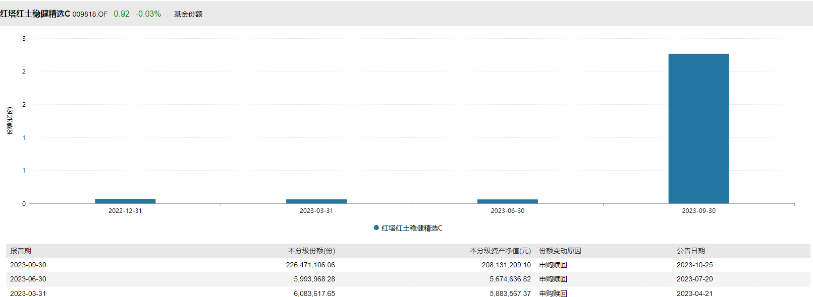 从上图不难发信,红塔红土稳健精选C类份额从6月底的不足600万份,直接上升至9月底的2.26亿份,对应的基金资产净值同期也从567.46万元陡然飙升至2.08亿元。