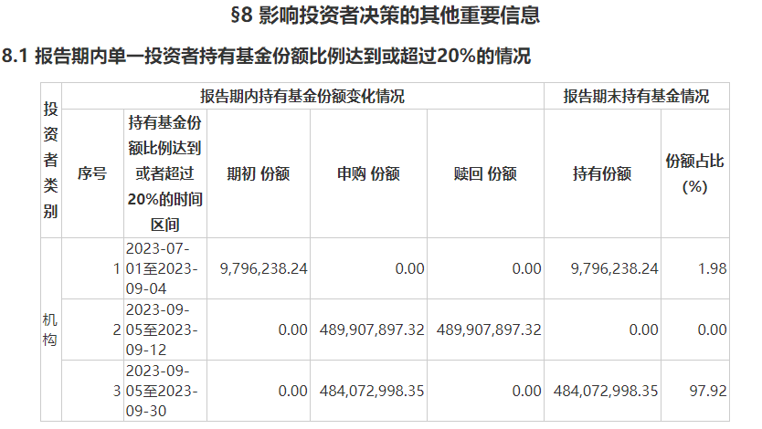 Wind数据显示,红塔红土瑞鑫纯债基金合计份额从今年6月底的1033.19万份增至9月30日的4.94亿份,基金规模合计同期从0.1055亿元猛增至5.1078亿元,均增长了约47倍。同样,红塔红土瑞鑫纯债基金的三季报显示,本基金连续六十个工作日出现基金资产净值低于五千万元情形;时间范围为2023年3月23日至2023年9月4日。不过,该基金披露的信息显示,此次规模的大幅增长则是来自机构资金的申购。