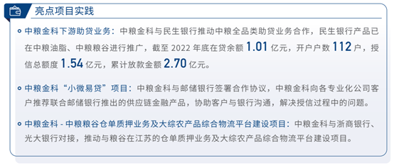 该部分业务以中粮金科、中粮期货和中粮信托为主要实施范围。其中,中粮金科加强对重要农产品生产加工、设施农业、农机装备以及仓储保鲜冷链物流设施建设的供应链金融支持;与民生银行推动中粮全品类助贷业务合作,截至2022年底在贷余额1.01亿元,授信总额度1.54亿元,累计放款金额2.70亿元。