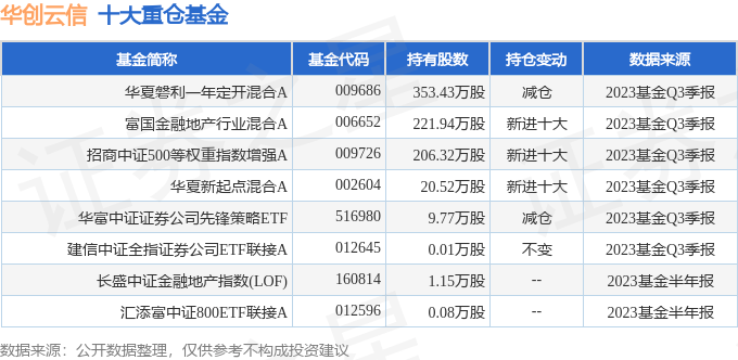 持有华创云信最多的基金为华夏磐利一年定开混合A,目前规模为4.67亿元,最新净值1.4895(10月30日),较上一交易日上涨0.88%,近一年上涨1.86%。该基金现任基金经理为张城源。