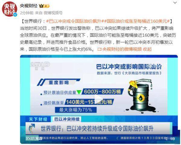 当地时间30日,世界银行发出警告称,巴以冲突如果继续升级扩大,将严重影响全球原油供应。在最严重的情况下,国际油价可能涨至每桶接近160美元,突破历史最高纪录,并进而推升食品价格。世界银行称,新一轮巴以冲突本月初爆发以来,国际原油价格至今已上涨大约6%。