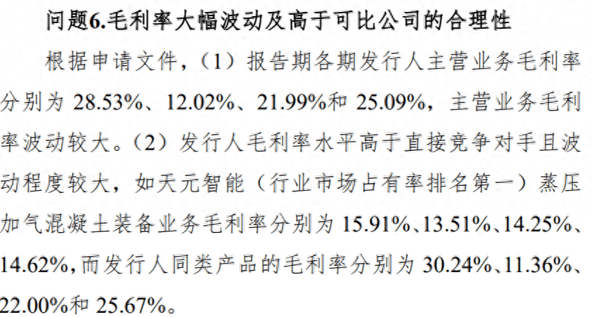根据申请文件,报告期各期东岳机械主营业务毛利率分别为28.53%、12.02%、21.99%和25.09%,主营业务毛利率波动较大;东岳机械毛利率水平高于直接竞争对手且波动程度较大,如天元智能(行业市场占有率排名第一)蒸压加气混凝土装备业务毛利率分别为15.91%、13.51%、14.25%、14.62%,而东岳机械同类产品的毛利率分别为30.24%、11.36%、22.00%和25.67%。