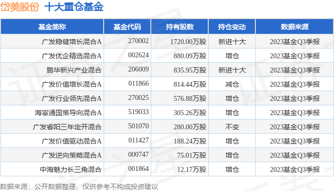 持有岱美股份最多的基金为广发稳健增长混合A,目前规模为150.04亿元,最新净值1.4922(10月30日),较上一交易日上涨0.17%,近一年上涨3.96%。该基金现任基金经理为傅友兴。