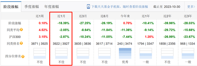 而在9月30日至10月30日近一个月时间,天天基金网数据显示,近1月,诺德新生活混合净值跌幅达18.39%,远高于同类平均和沪深300指数的跌幅。